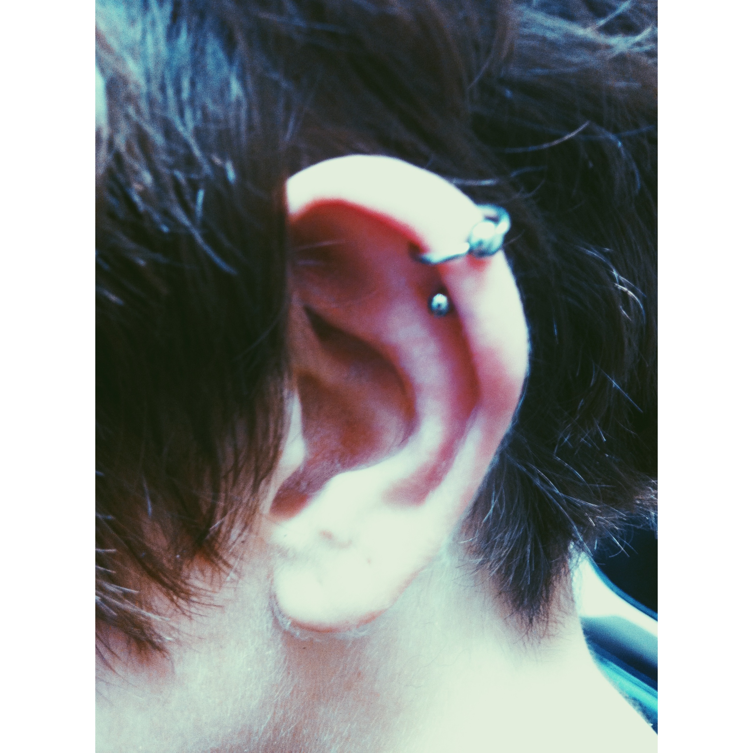 Top Ear Cartilage April 30, 2014 — Leave a comment Top Ear Cartilage Piercing Here’s a top ear piercing w/1.2mm x 8mm titanium bar, underneath the BCR; the lower of the two piercings. Share this: Click to share on X (Opens in new window) X Click to share on Facebook (Opens in new window) Facebook Like Loading...