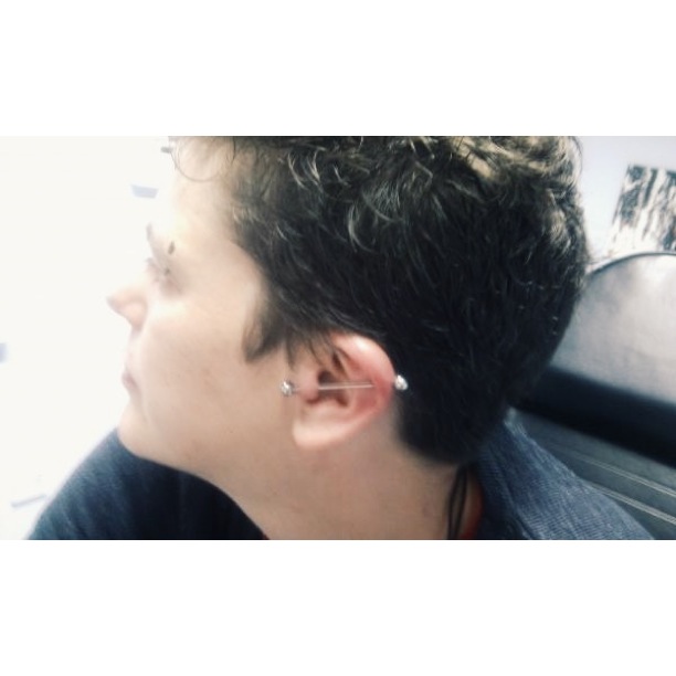 This was the first (2011) and rare a time I do this. Usually I would recommend bars only and in some cases, one piercing at a time for some people; but this was two piercings done at the same time and fitted with a BCR (Ball Closure Ring) It’s kind of hard to do because if you don’t get your measurements right, it can warp/stress the ear and inevitably get infected/never heal. This was however perfect and healed accordingly.