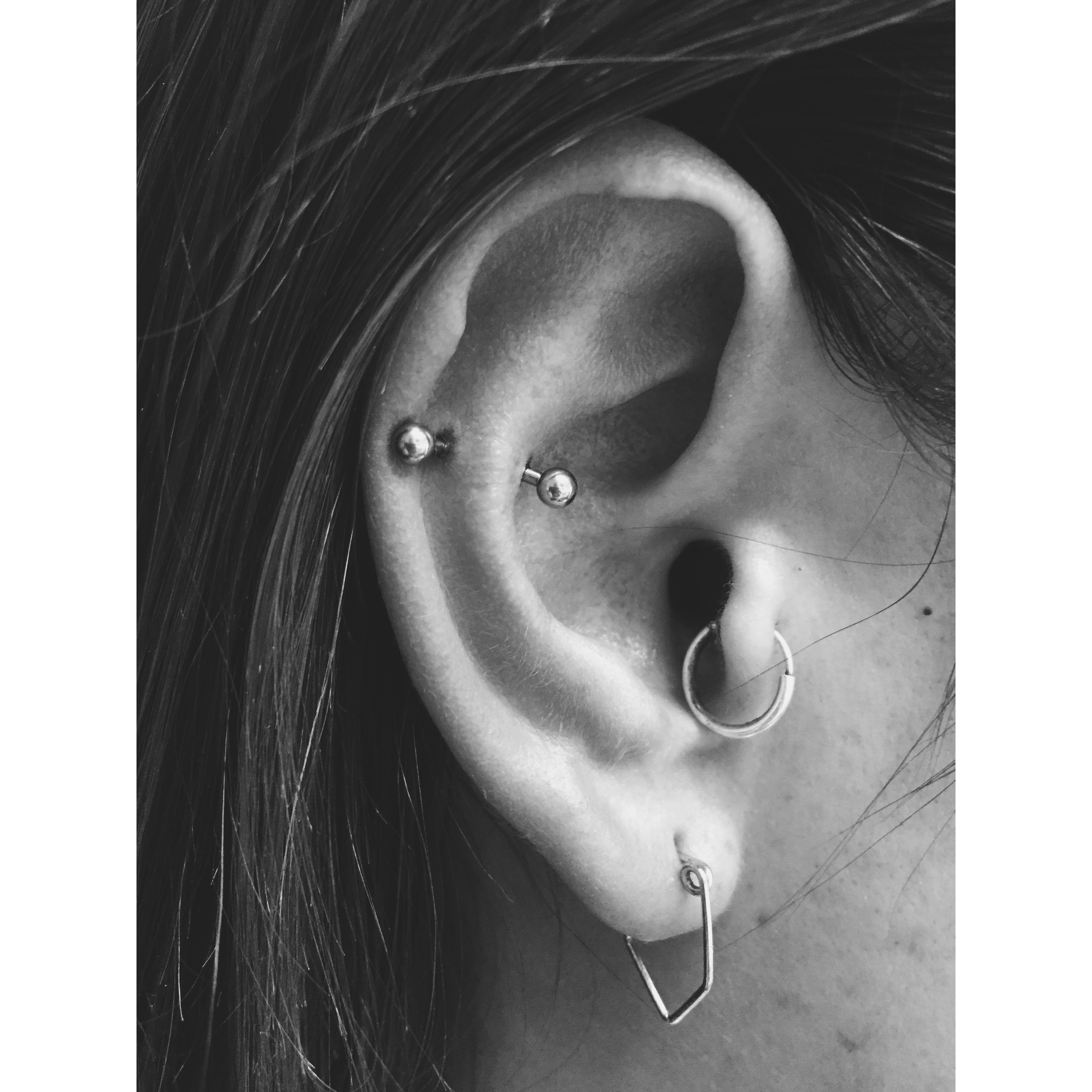 Double piercings for the lovely Rachel, a snug drift on the right ear and the anti-tragus on the left; both w/1.2mm curved titanium bars.