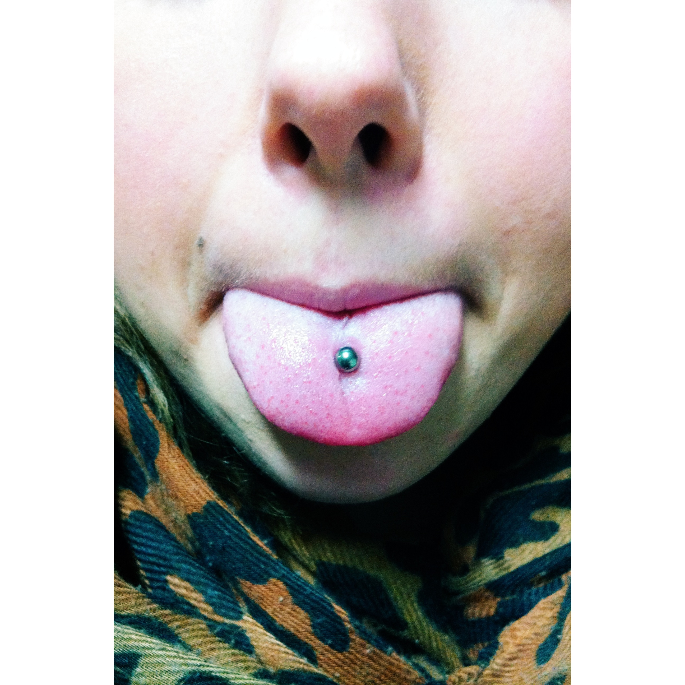 Danielle’s tongue pierced w/1.6mm x 20mm titanium bar and later changed down to a 1.6mm x 16mm bar; pierced by El Capitan @ Shiva Piercings.