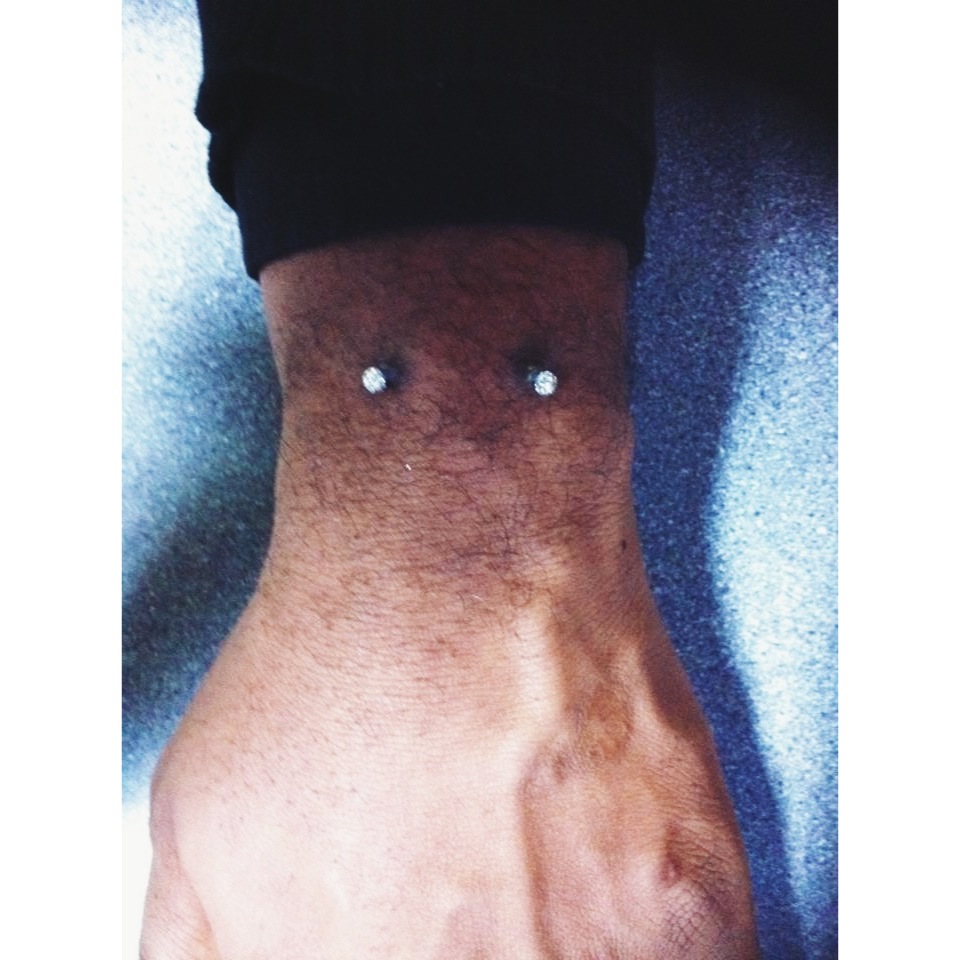 Wrist Surface Piercing April 8, 2014 — Leave a comment Daniel’s Wrist Surface Piercing Here’s Daniel’s wrist surface piercing w/1.6mm PTFE plastic bar and clear gem balls.