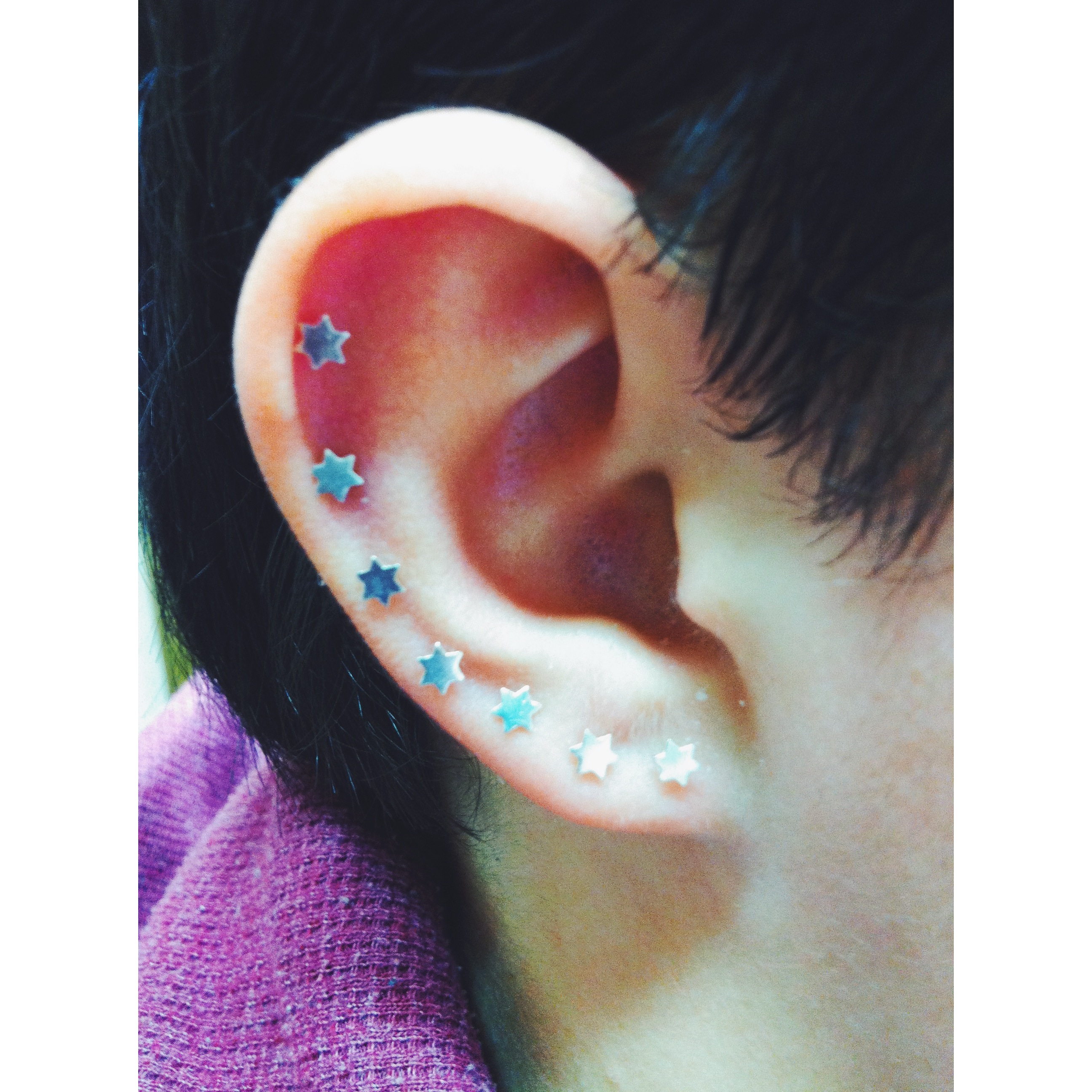 The top five stars of the seven, lower to top ear cartilage; were pierced by myself over the years by needle w/titanium bars and later changed to silver star studs. They look awesome and again, big thanks and love to my many lovely and loyal customers! Much appreciated and it’s always kool to see what customers n’ clients change up to once fully healed!!