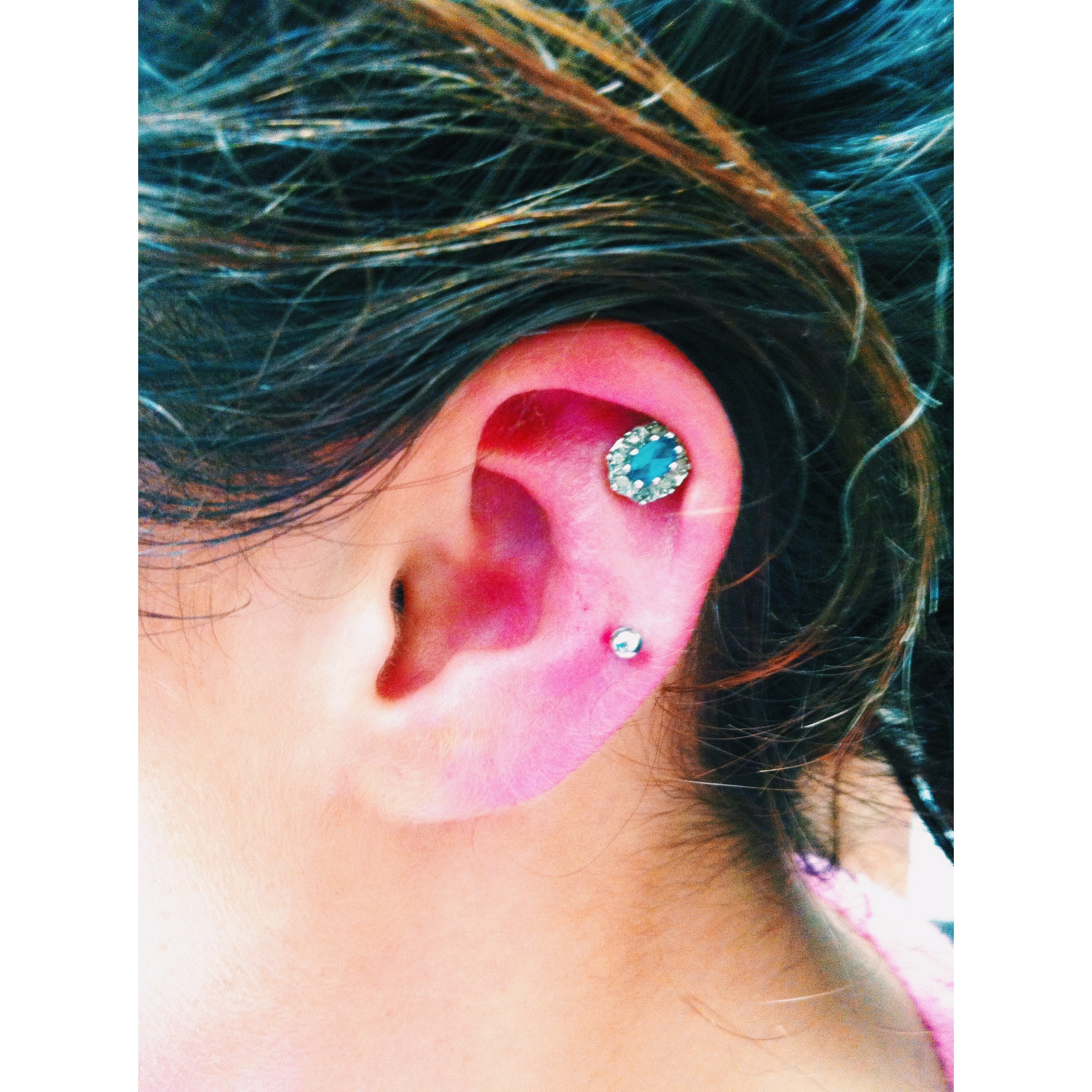 More double piercing action! A tragus pierced w/1.2mm x 8mm titanium labret bar on the right ear and an aqua gem stone fitting on an existing top ear piercing. On the left ear, the middle piercing of the trio was pierced by myself w/1.2mm x 8mm titanium bar w/clear gem stone head. The two either side were pierced by Kelly (instagram.com/pinholepiercings) @ Shiva.