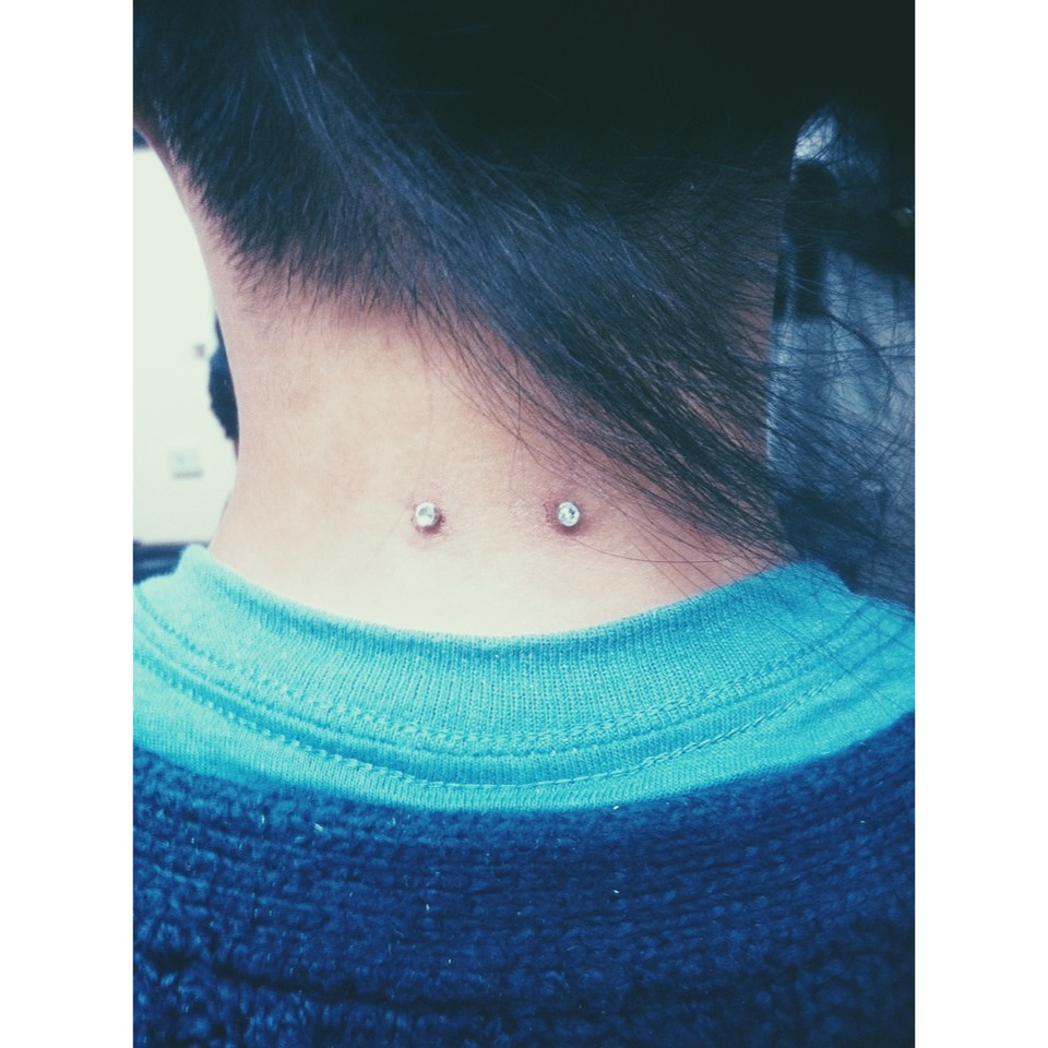 The lovely Miari’s latest addition – a nape piercing w/a pair of microdermal anchors at the base of the neck w/4mm clear crystal gemstones pierced @ Shiva.