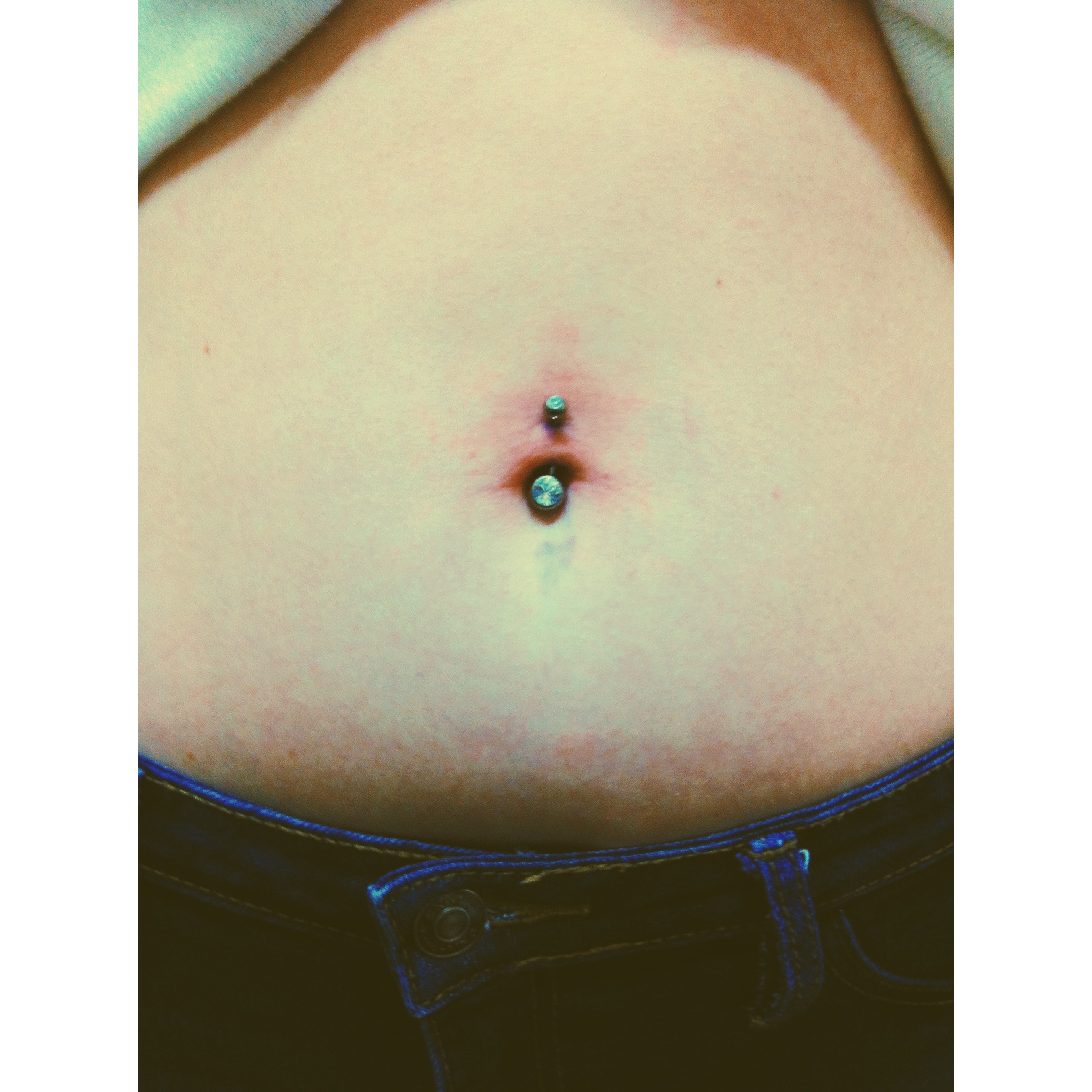 A navel pierced w/1.6mm x 12mm (petrol) coloured titanium bar w/white gem disco balls for that extra shimmer.