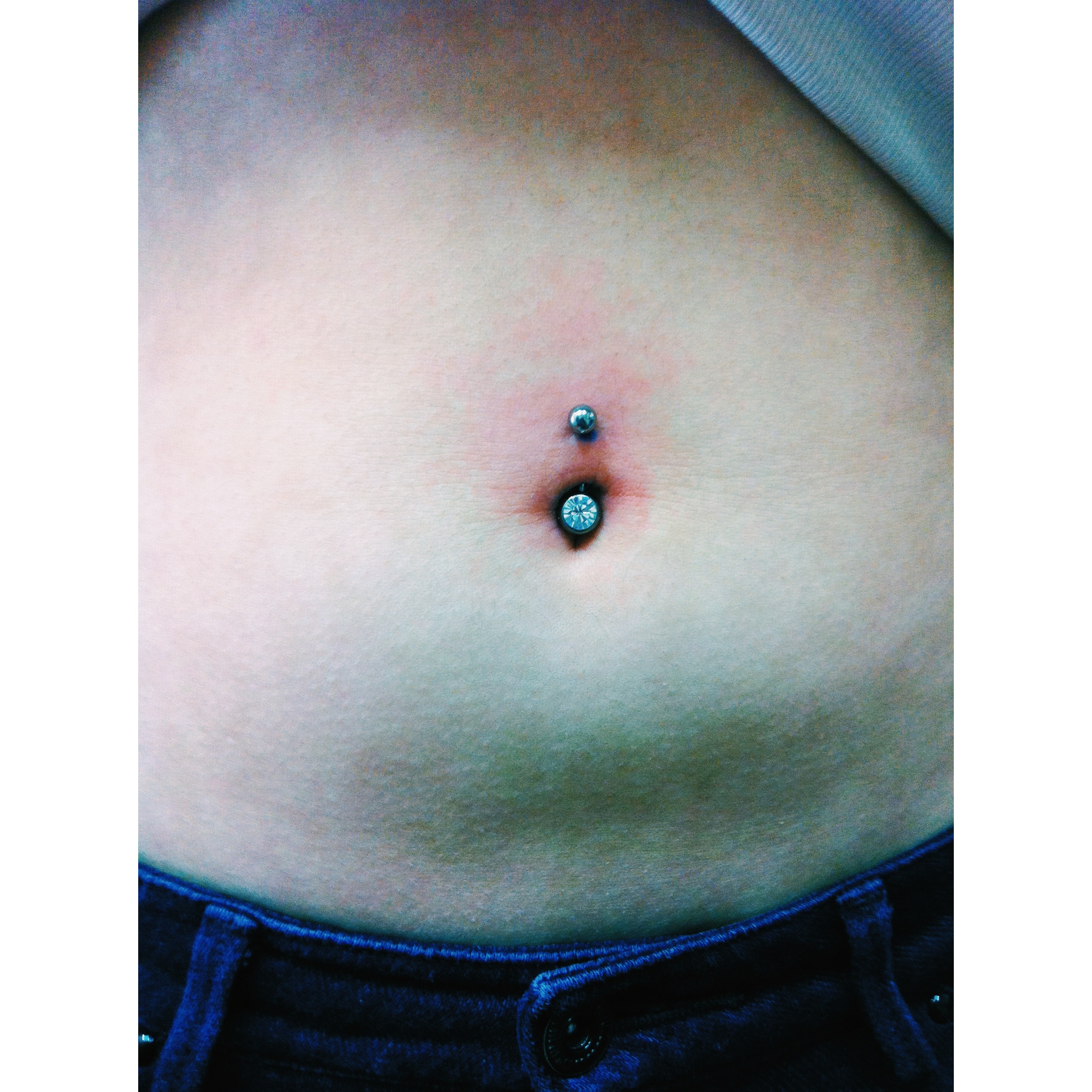 Navel piercing w/1.6mm x 12mm titanium bar and acrylic white disco gem balls.