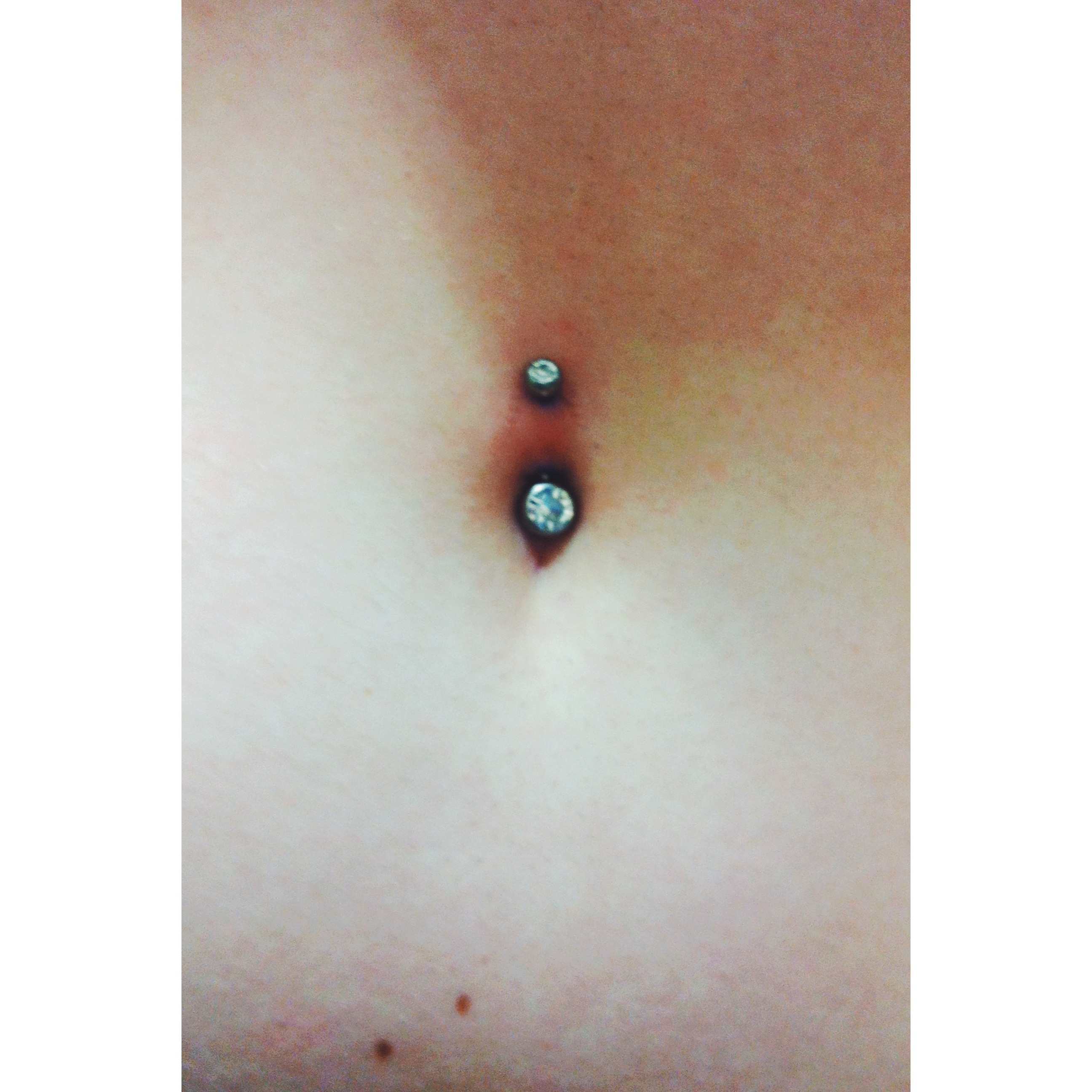 Skye’s navel piercing w/double clear gem stones, 1.6mm x 12mm titanium curved bar by El Capitan @ Shiva Piercings.