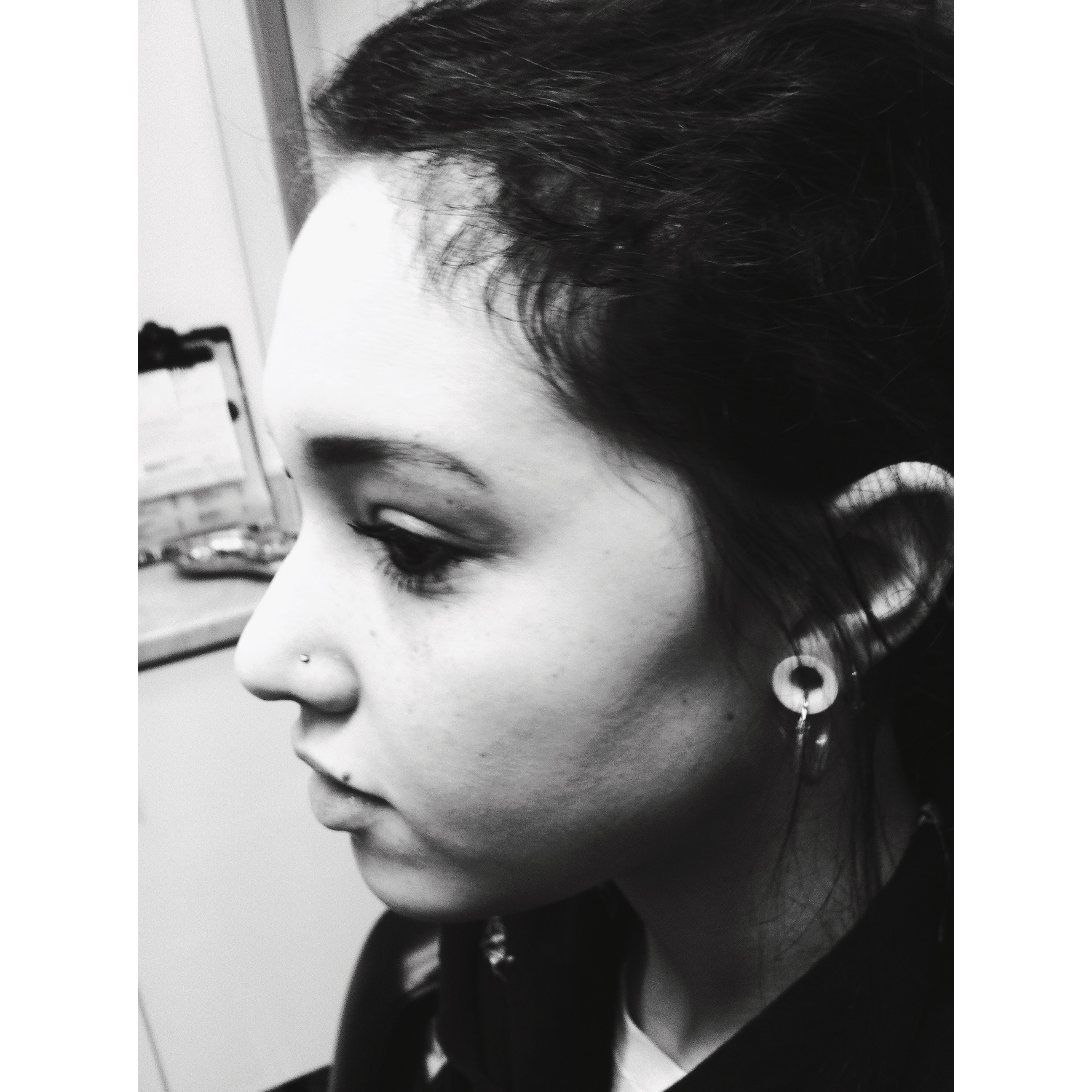 Becca’s nose pierced w/titanium cone/mini-spiked head. Nose piercing is also still as popular as ever, I always advise wearing the initial jewellery whilst cleaning twice daily; for around three months post-piercing. Usually within three or four months, if healing well a ring or alternative jewellery can be switched. Sometimes however, a piercing (nose or otherwise) can take up to a year to fully heal… so be patient whilst healing, persistent when cleaning and conscious of whatever future metal you may wish to wear.