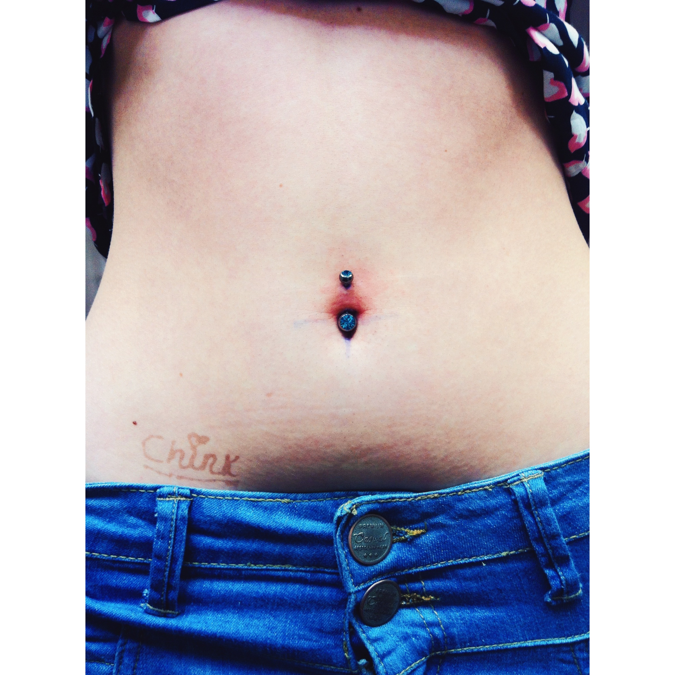 This is the first time I’ve ever pierced anyone in my family! I’ve pierced thousands of people by now be them obviously the general public, friends, grrlfriends, other piercers, tattooists, many artists in general; and now finally family. I’ve literally pierced people from every geographical corner of the planet that you could imagine, but it’s a compliment to be trusted by those close to you. This piercing is also special as I first met Vicky, my cousin Camille’s daughter; when she was about four or five weeks old. Still to this day maybe, the youngest person I’d ever met! Weirdly, I first met and held her on the same day I found out my Gramps had passed away; I would have been around fifteen at the time and meeting little Victoria helped ease the pain and devastation of unexpectedly losing my Gramps. I just remember a numbness lifting, as I held you for what felt like hours. Blood runs deep, on my mother’s side at least. I also would like to point out my cousin Milly even text me the very morning to state how she didn’t want Vicky getting it done, but as it was me who was doing it. I want to tell all my customers, I totally understand this and have many parents bringing their teenagers in for piercing. I tell them all the same, your parents are probably against piercing because they naturally should think you’re perfect as you are. Vicky had her ears pierced twice (not by me) and both times had infected and rejected but I did those last Summer for her and as she looked after them my cuz’ finally allowed Victoria a navel piercing. Which I can say for sure, she is looking after and healing well! I pierced Vicky w/1.6mm x 12mm curved titanium bar w/blue zirconia double gem stones.