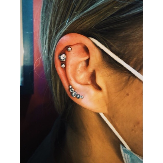 Decorated in disco! Various ear work on the lovely Lisa including a double conch, tragus, helix and third lobe piercings, pierced over the months and years @ Shiva. As always, it is the continued level of trust, confidence and appreciation that makes piercing people such a sacred privilege. Thanking all of you!
