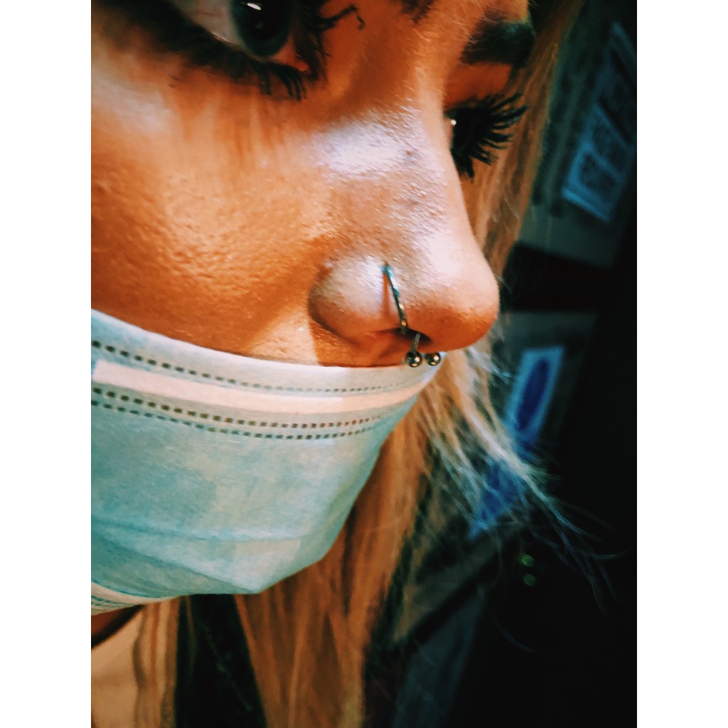 Emily’s Septum piercing w/1.2mm x 8mm CBB pierced by El Capitan @ Tattoo 13 in Soho.