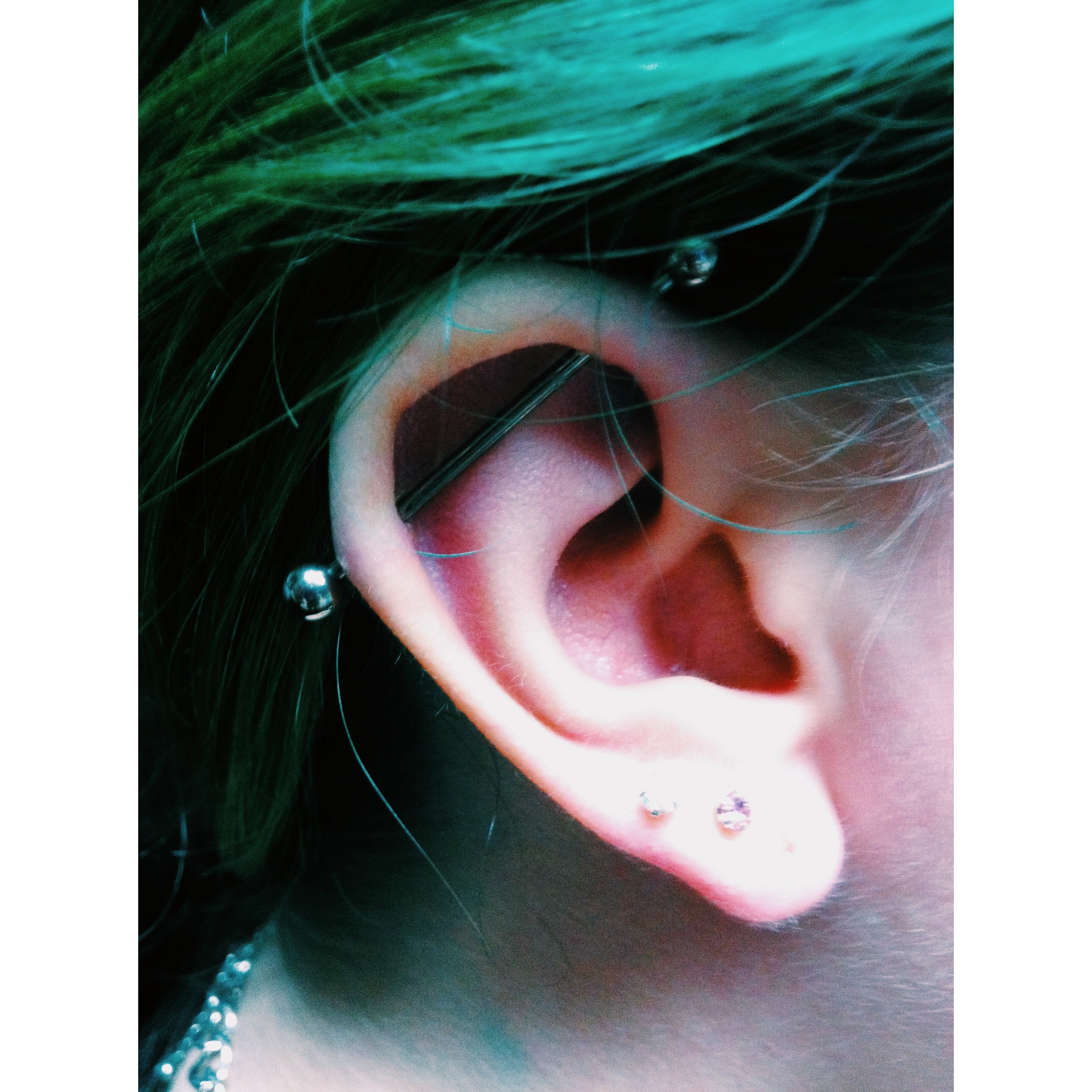 Marie’s scaffold piercing w/1.6mm x 38mm titanium bar. I like the second picture because you can see both piercings.