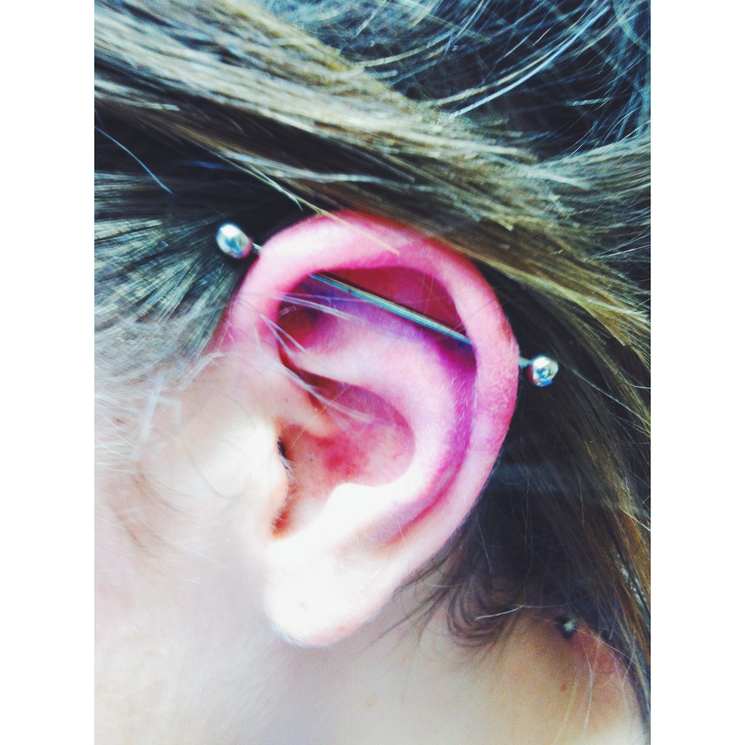Marie’s scaffold piercing w/1.6mm x 38mm titanium bar. I like the second picture because you can see both piercings.