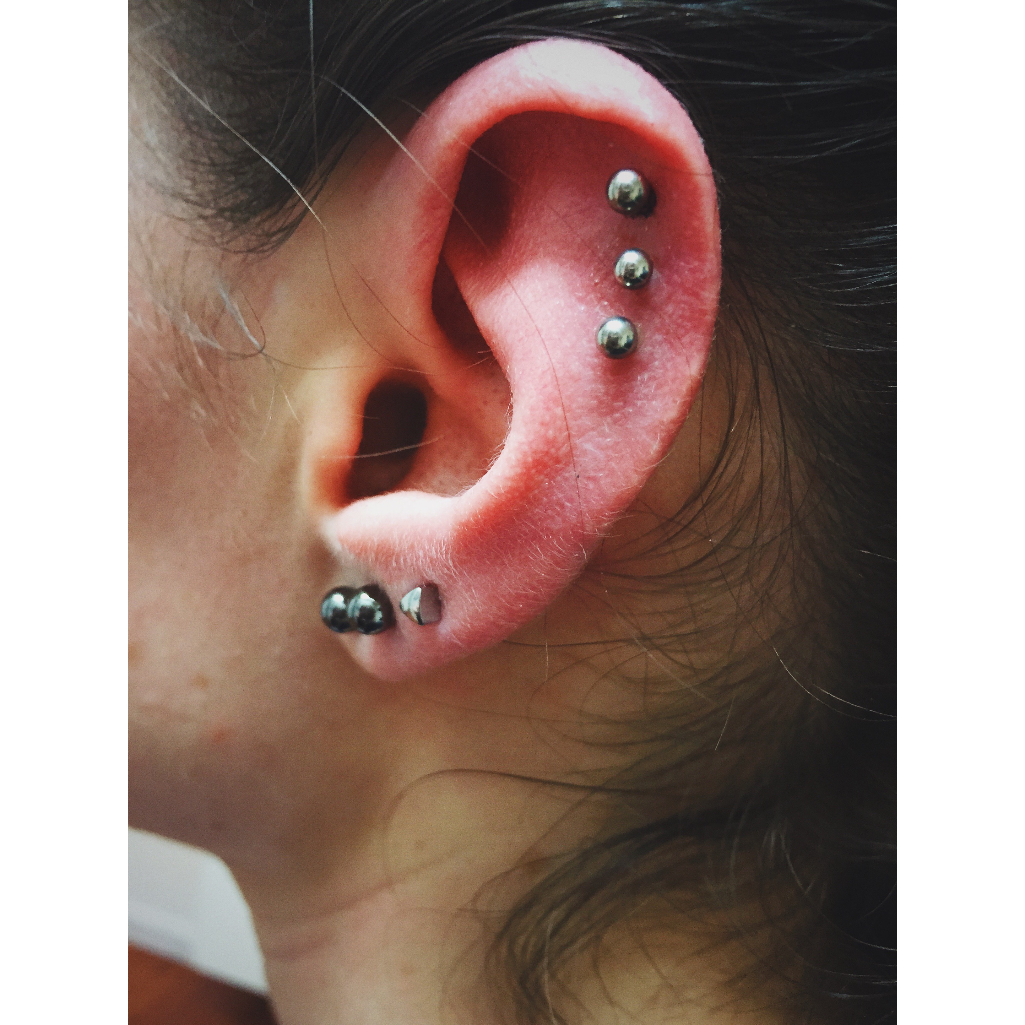 Megan’s triple helix piercings, pierced w/1.2mm titanium labret bars @ Shiva.